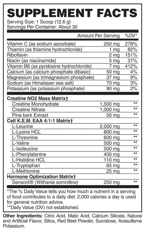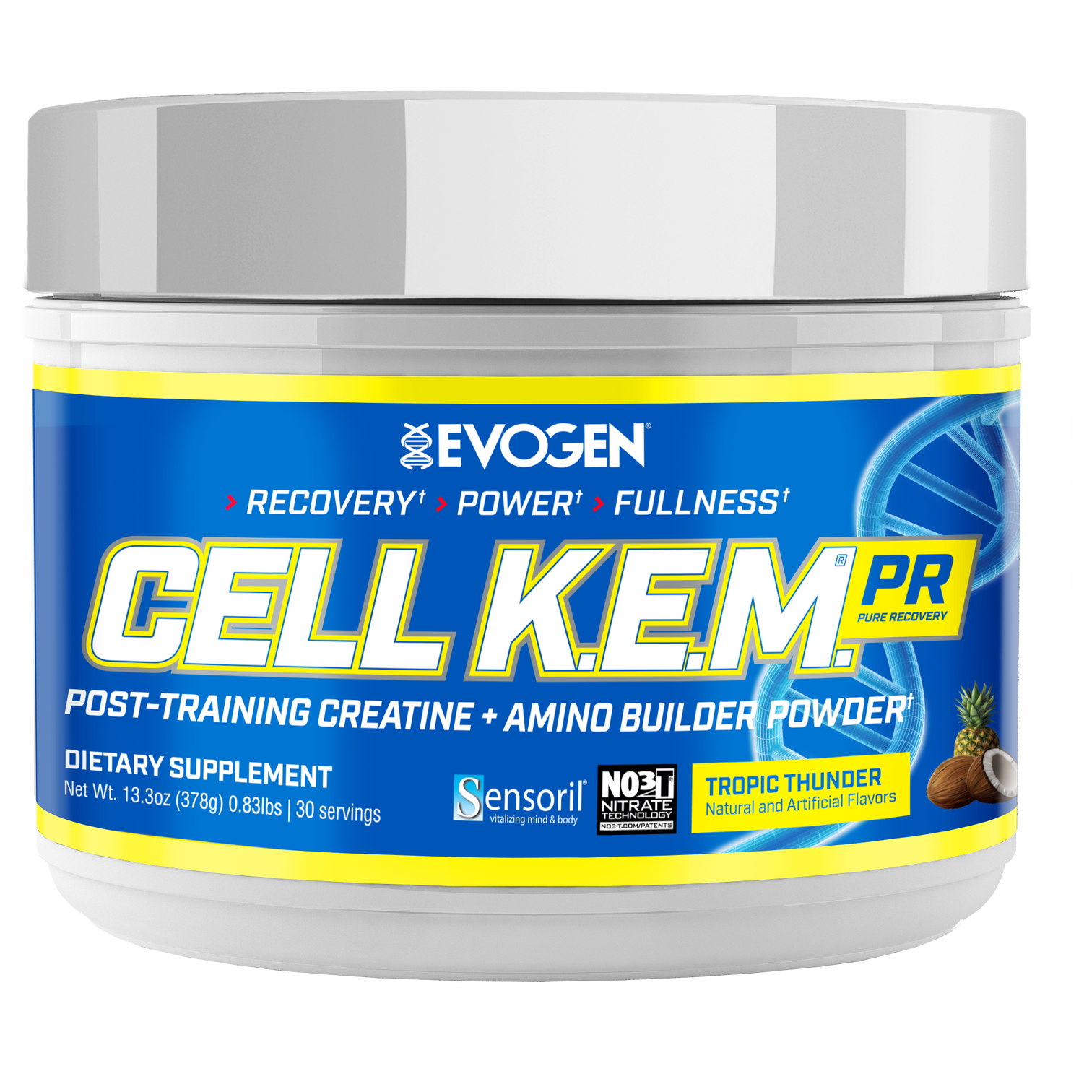 Evogen's Cell KEM is an amino builder recovery product that will maximize muscle growth and fullness post workout. It is packed with all 9 essential amino acids including the branched chain amino acids at a 4:1:1 ratio. This higher leucine content helps kickstart muscle protein synthesis. This product also contains electrolytes to help replenish and rehydrate the cells. It contains 2.5 g of creatine in monohydrate and nitrate forms. Last but not least it contains 250 mg of Sensoril which is a patented ashwagandha that helps lower cortisol post workout and aids in recovery and muscle growth.