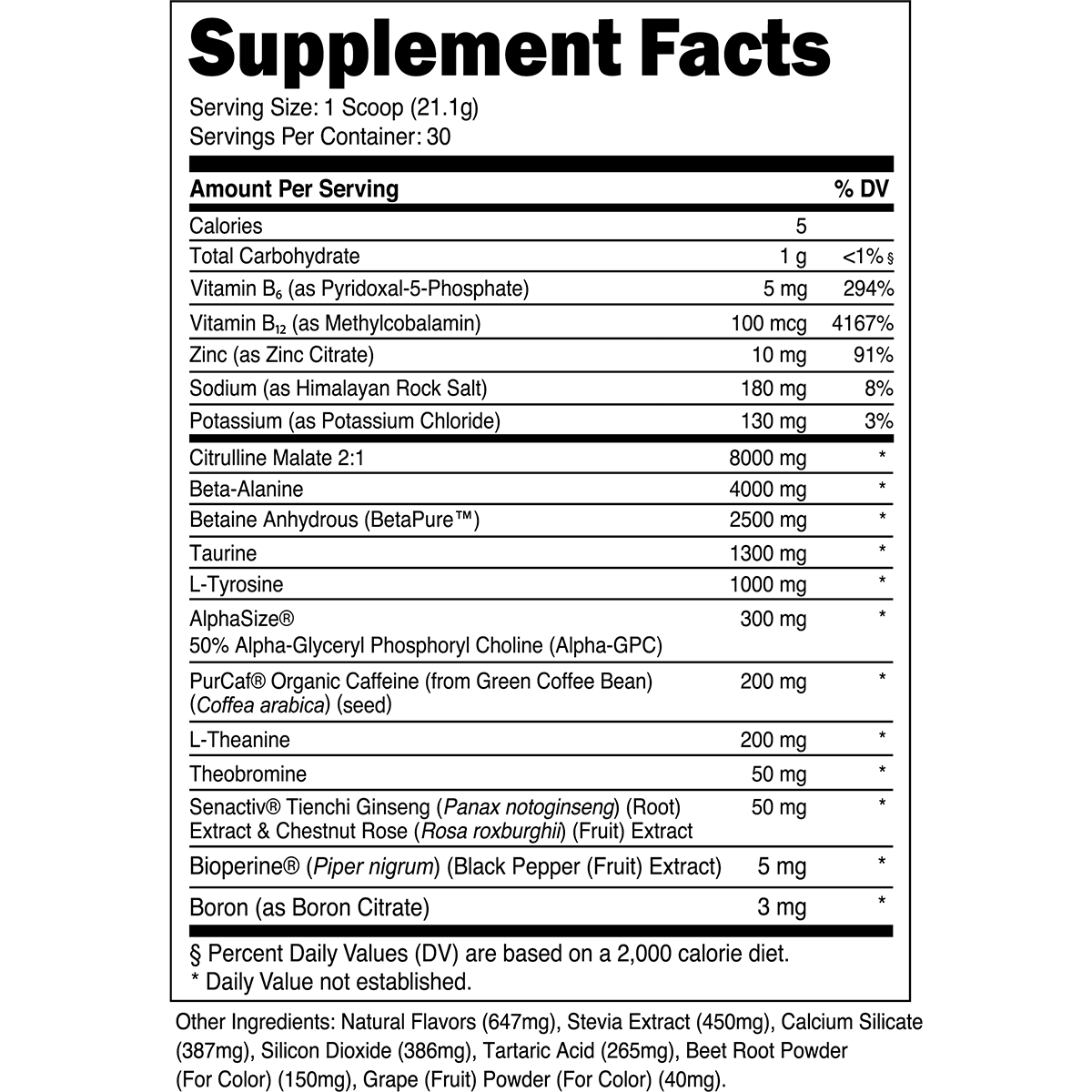 Each scoop contains 17 grams of clinically dosed, active ingredients—including 8g of l-citrulline malate, 4g of beta-alanine, 2.5g of betaine anhydrous, and 200mg of caffeine.