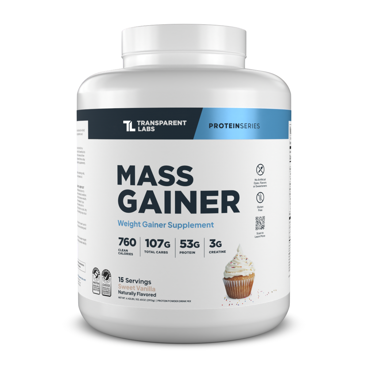 Mass Gainer from Transparent Labs is a whole food-based, easily digestible meal replacement and post-workout recovery shake. Built to help you pack on serious mass, this weight gainer contains 53g of grass-fed whey protein concentrate, 770 calories, 3g of pure creatine monohydrate, and 107g of slow- and fast-digesting carbohydrates from wholesome sources in every serving.